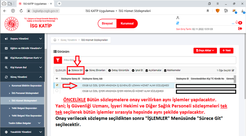 7. Onay verilecek olan iş güvenliği profesyoneli (iş güvenliği uzmanı, işyeri hekimi veya diğer sağlık personeli) sözleşmesi (sadece bir sözleşme) seçilerek üst kısımda bulunan "İŞLEMLER" menüsünden "Sürece Git" butonuna basılacaktır.
