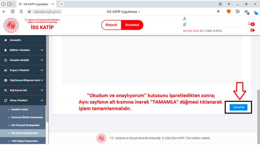 8. Ekranda beliren bilgilendirme metnini "Okudum ve onaylıyorum" seçeneğini tıklayarak ve sayfanın altında bulunan "Tamamla" butonuna basarak sözleşmeyi onaylamış duruma geleceksiniz.