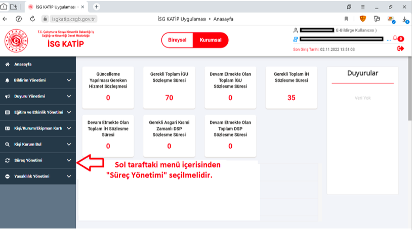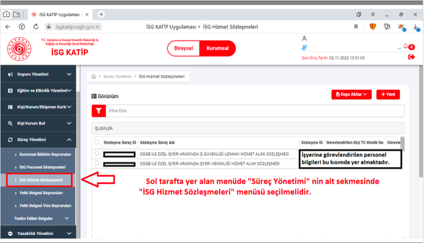 6. Açılan sayfada sol tarafta bulunan "Süreç Yönetimi"ne tıklanarak, alt menüsünde bulunan "İSG Hizmet Sözleşmeleri" sekmesine tıklanmalıdır. Sağ bölümde iş güvenliği uzmanı ve işyeri hekimi isim soyisim bilgileri görünecektir.