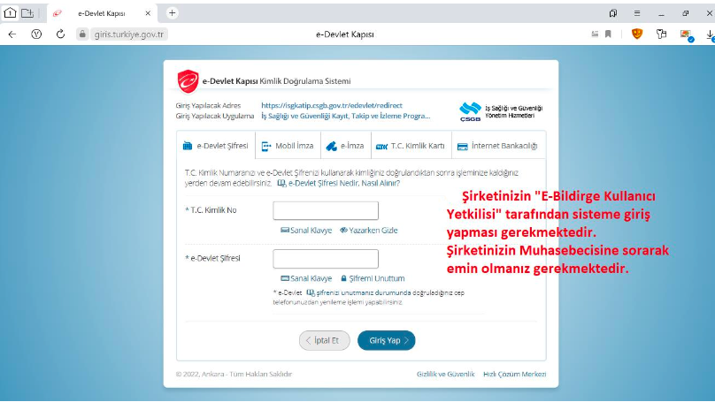 3. Şirketinizin "E-Bildirge Kullanıcı Yetkilisi" tarafından TC kimlik numarası ve e-devlet şifresi ile sisteme giriş yapılmalıdır.